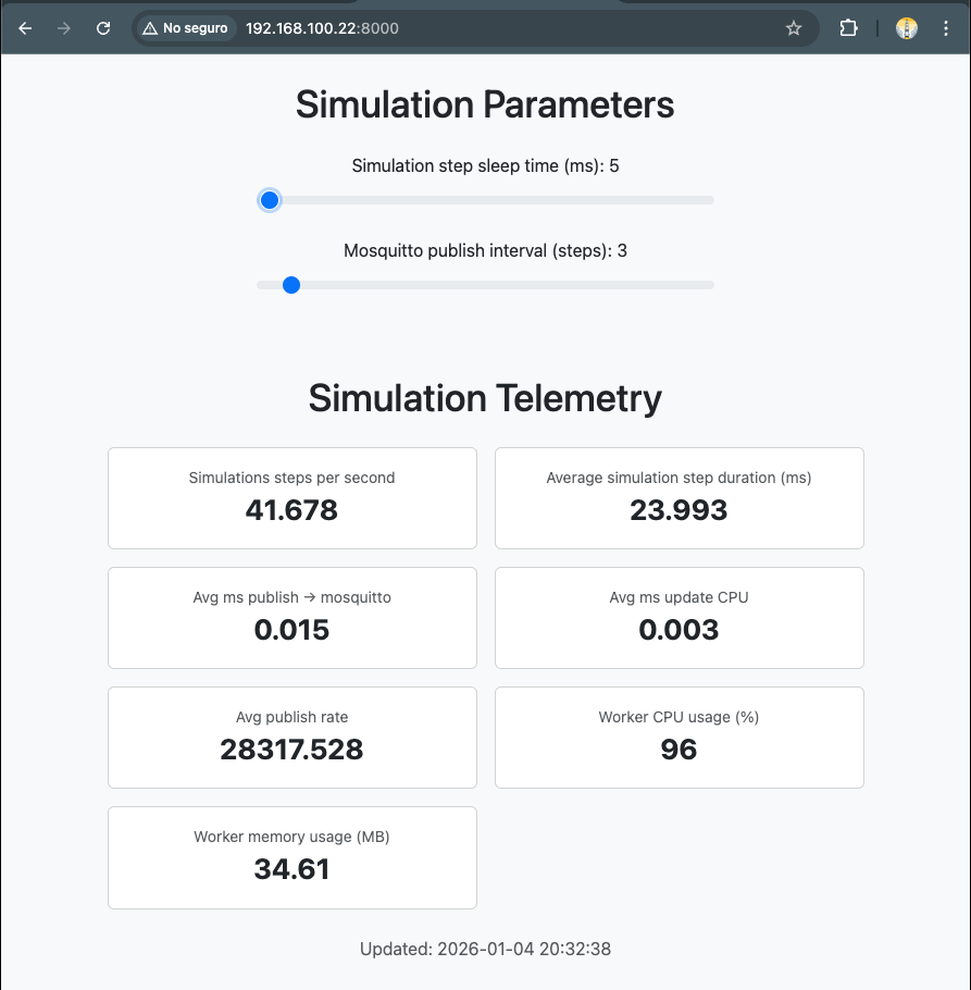Using a basic Mini PC with an Intel N150 chip, I was able to simulate 2,000 CPUs, each streaming its temperature values to the MQTT broker (Mosquitto). At this scale, I managed to run the simulation at a rate of 40 steps per second, sending approximately 28,000 messages per second to the MQTT broker.