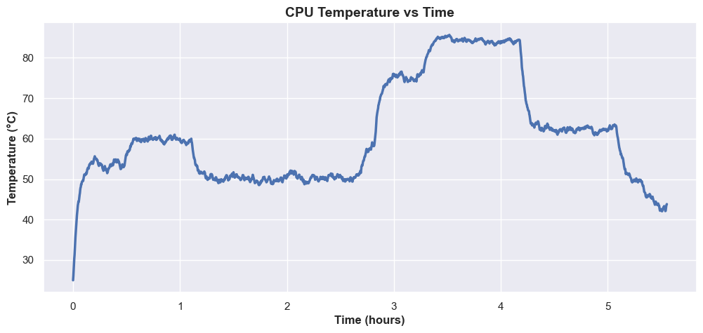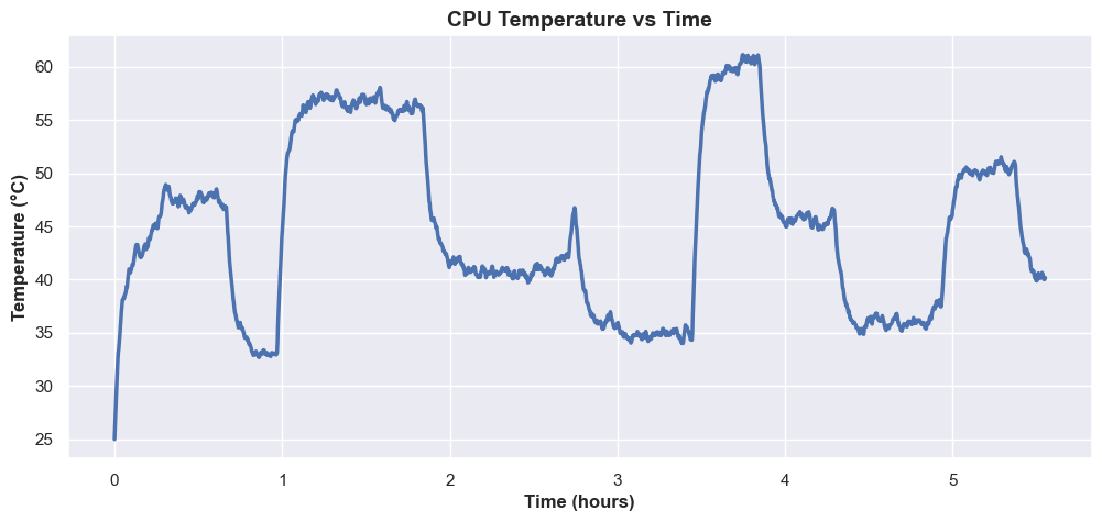 The following plots illustrate how CPU temperature values evolve over time. The examples below show two simulations running continuously for six hours.